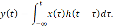 If we continue to reduce the pulse duration in this manner the limit as that duration approaches zero is the function represented by the solid black curve. That function is sometimes referred to as the system’s “impulse response,” or its response to the Dirac delta function. (The Dirac delta function of time t is defined as having a function value of zero for non-zero time values but having a time integral of unity over any interval that brackets time t = 0.) In the limit the response y to an arbitrary stimulus x therefore equals the sum of an infinite number of time-translated infinitesimal-magnitude replicas of that impulse response scaled by corresponding values of the stimulus x.