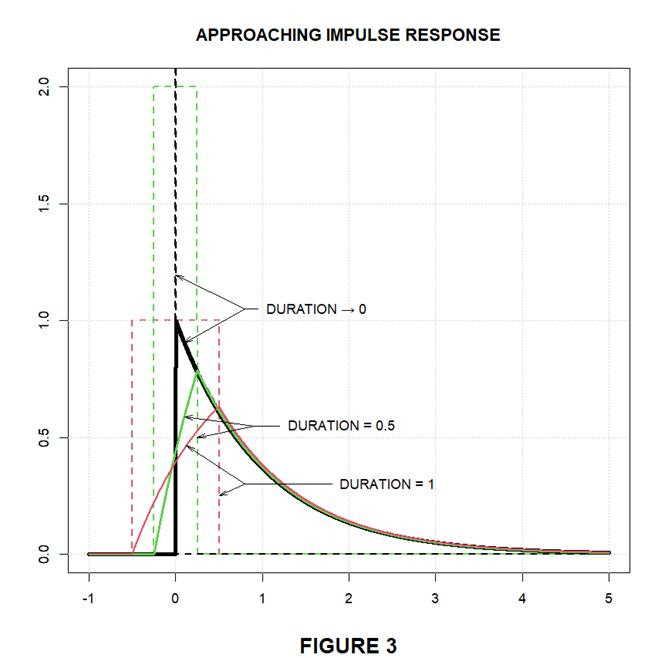 Again, we can approximate a time-invariant linear system’s response to the given composite stimulus by summing time-translated and scaled replicas of the basis stimulus’s response. Moreover, although such an approach’s result is merely an estimate, it approaches exactitude as the pulse duration approaches zero. The plot below illustrates taking the thereby-approached limit of the pulse response.