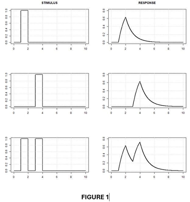 As we stated above, Monckton et al.’s Equation 1 therefore purports to base approximation of a system’s output on what its output would have been if the stimulus had been a step function. As background for our next post’s demonstration that it goes about this in the wrong way this post will describe the correct approach. And that approach is based on “superposition.”